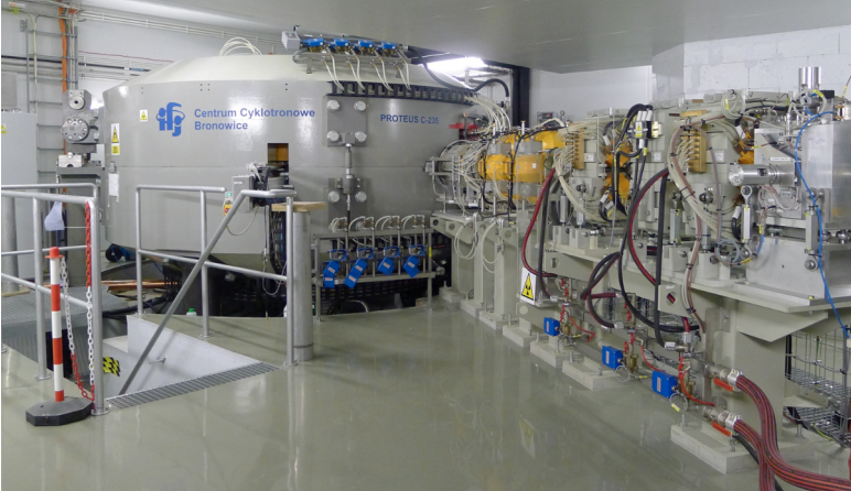 Protons are accelerated up to an of 230 MeV by the Proteus C-235 cylotron. The cyclotron is primarily used for medical purposed but can be applied for secondary applications as well. The cylotron is an isochronous cyclotron with a compact conventional magnet. An energy degrader allows the beam energy to be reduced to 70 MeV.